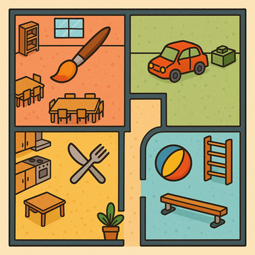 In unserem Kindergarten gibt es ein Bistro zum Frühstücken, Mittagessen und Snacken, einen Rollenspielbereich, einen Raum für Tischspiele und Puzzle, einen Kreativraum, eine Bücherei mit Rückzugsmöglichkeiten, einen Konstruktionsraum, einen Werkraum, einen Forscherraum und einen Bewegungsraum. Zusätzlich dazu können die Kinder den Flur und das Außengelände nutzen.
